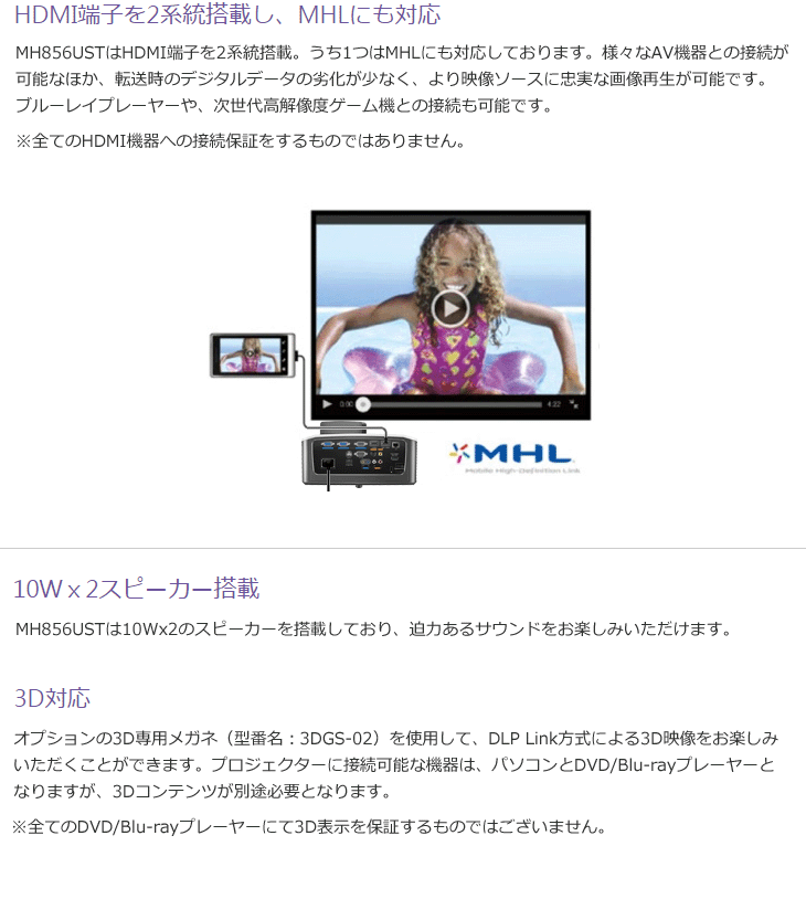 | DLP超短焦点プロジェクター フルHD(1920×1080) 3500lm(3500ルーメン) MH856UST スペック情報 | |