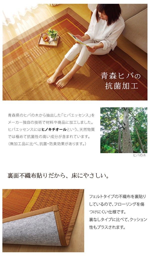 現代のライフスタイルに合う、洗練されたモダンなデザインのい草カーペットです。国産(九州産)のい草を使用しています。一本一本が太く、表皮が厚く繊維がキメ細かいので弾力性があり、耐久性に優れています。い草には空気の自然浄化作用、湿度の調節作用などがあります。また汚れにくく、使用するうちに黄金色に変化し味が出ます。フローリングを傷つけにくいよう、裏には不織布を貼っています。い草に青森ヒバ加工を施しています。(抗菌、防臭効果)