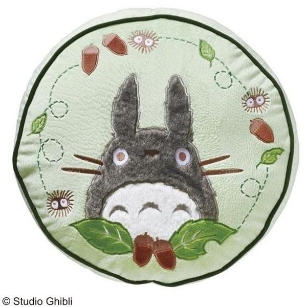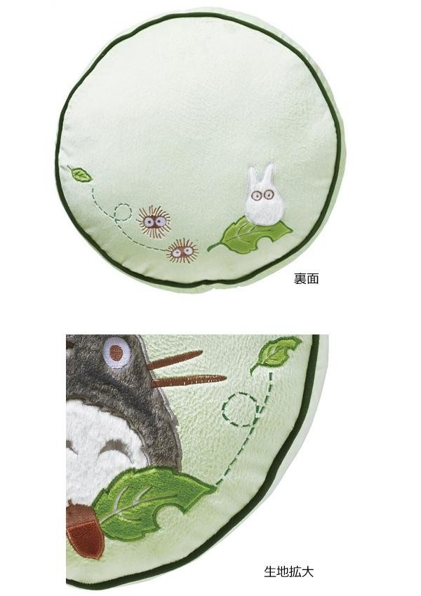 アップリケ刺繍が施されたとなりのトトロの円形クッションです。