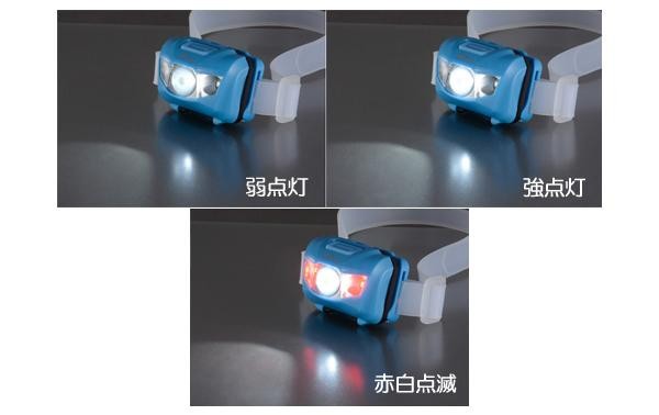強点灯・弱点灯・赤白点滅の3WAY点灯!!角度調節もできてIPX6(※)の対暴噴流仕様なので、様々な場所での作業に適しています。滑り止めシリコンバンド使用!!