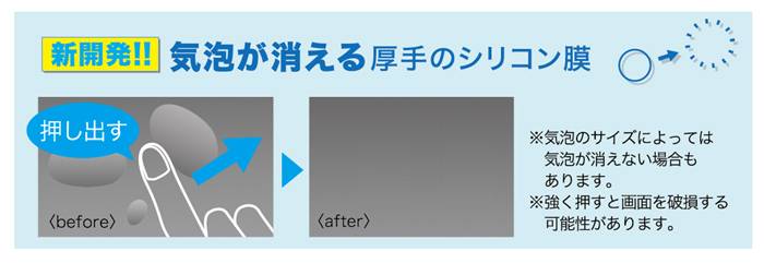 ???貼り付け面にやわらかく厚手のシリコンを採用。貼るたびに発生していた、小さなホコリによる気泡をフィルムがつつむように吸収。気泡が消えたように見えます。