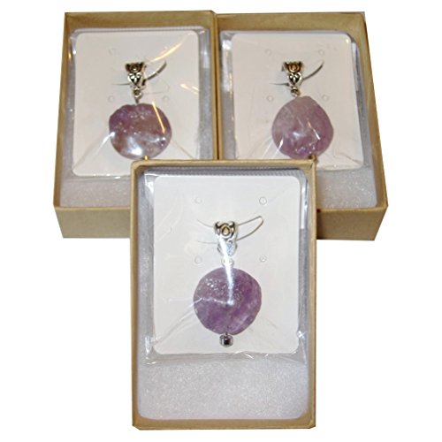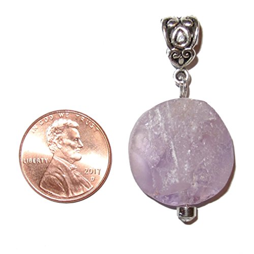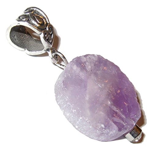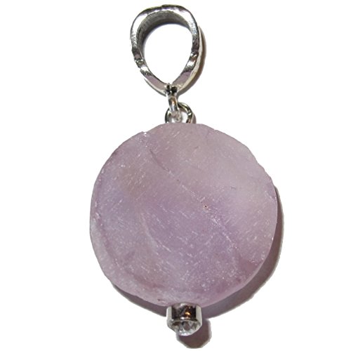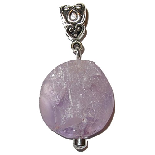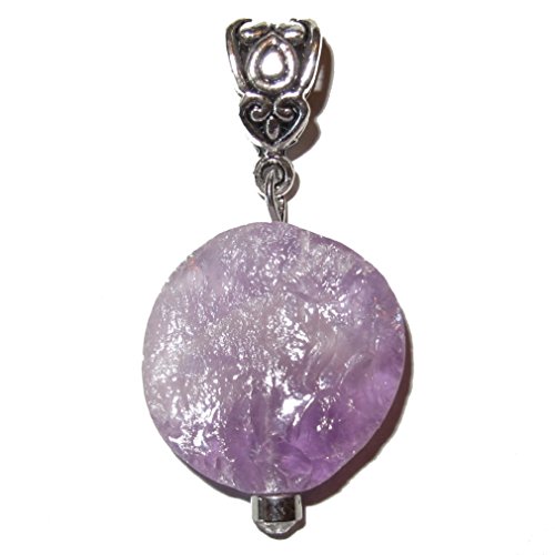 This beautiful crystal pendant is made from genuine violet purple Amethyst gemstone. It is round with a rough natural cluster-like front and hangs on a nice silver toned metal bail. It comes in a gift-ready Satin Crystals box. Receive one unique pendant per order from an elite hand picked lot.
