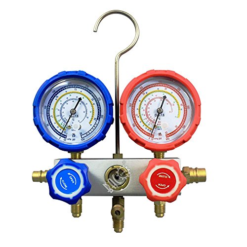 Gauge Set -- 2 Valve Manifold with sight-glass & 1/4" SAE fittings anodized aluminum block body, oversized sight-glass for easy viewing the refrigerant flow high quality stainless steel gauge and high accuracy of reading