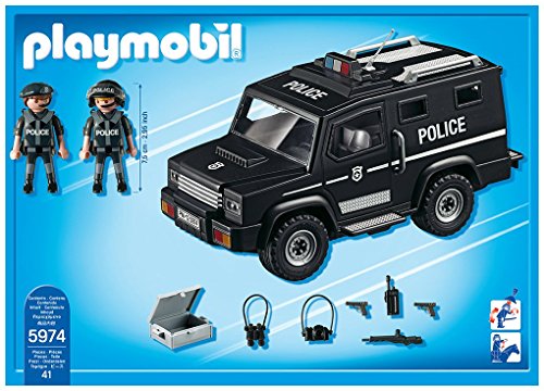 -. Feature : Save the day with the Tactical Unit Car / Playmobil is the largest toy manufacturer in Germany / Figures can bend, sit, stand and turn their heads / Encourages children to explore and learn while having fun / Includes 2 figures, armored vehicle, walkie talkies and other accessories