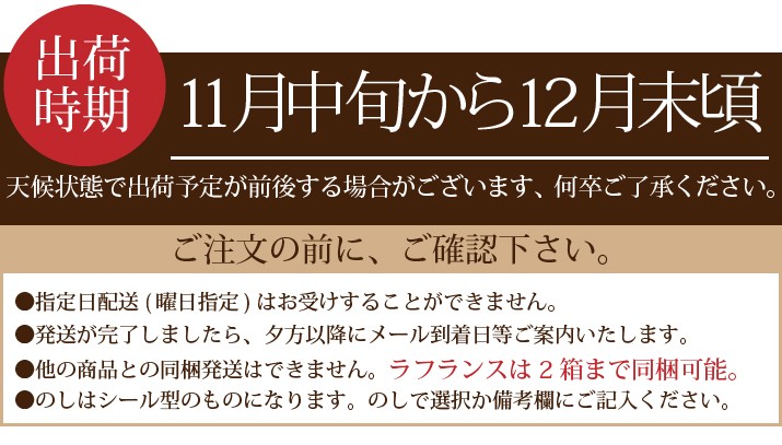 | お届け方法 お届け時期 | ![]() ※この商品は日付指定が出来ません。出荷後にメールで到着日をお知らせいたします。 ヤマト運輸の常温便で山形県からお届けします。 出荷予定:11月下旬~12月末頃までご注文受付順に出荷 ※天候状態や成長の様子で期間が前後します。 |