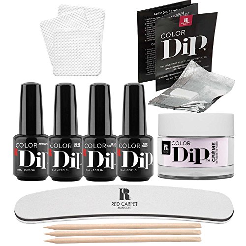 Studio : Red Carpet Manicure Publisher : Red Carpet Manicure Binding : Misc. Product Description Plain nails are just plain sad, so dazzle the world with a brand new way to manicure using this Red Carpet Manicure Color Dip Nail Color Dipping Powder Starter Kit. This kit includes: -Base coat (9 mL) -Activator (9 mL) -Top coat (9 mL) -Brush softener (9 mL) -Instructional brochure -Contract Please dip powder color (0.3 ounces) -Nail wipes (20) -Wood sticks (3) -Groom buffer (1) -Remover foils (10) -Replacement brushes (5) Once you use this Red Carpet Manicure Color Dip Nail Color Dipping Powder Starter Kit, you won't want to do your nails any other way. 0