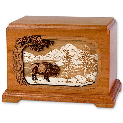 Studio : TreasureLine Publisher : TreasureLine Binding : Health and Beauty Product Description Gorgeously crafted premium wood cremation urn, made to order for you right here in the USA in an Oregon woodshop. The Buffalo wood art scene presents a detailed laser etched inlay composed of various hardwoods in their natural colors inset into the wood cremation urn to give the look and feel of 3 dimensions. A beautiful memorial urn tribute to the one who loved the great American outdoors, this funeral urn has an industry standard adult urn capacity of over 200 cubic inches or a double urn capacity of 400 cubic inches. This is equal to the remains of a person who weighed up to 200 lbs, and the companion urn option has a capacity for the remains of a couple who weighed a combined 400 lbs, which is plenty of room for a loving couple such as a husband and wife. These items are individually handmade to order right here in the USA. Please allow 1-3 business days for production. The Buffalo Urn is available in your choice of solid premium Mahogany, Maple, Oak, and Walnut woods, crafted in our classic "Hampton" funeral urn shape. Thick, hearty woods are used, making this a solid and premium heirloom urn with a natural clear finish. Usage: Bottom-opening panel attaches with standard screws. To open, simply remove the screws and bottom panel, place the plastic bag containing the cremated remains into the urn, and re-attach the panel. No need for sealant or glue. Exterior dimensions: of Standard Size urn: 11" wide, 9" high, 7.5" deep. Exterior dimensions of Companion Size urn: 12" wide, 8-1/2" high, 8-1/4" deep. Urns Northwest has been your premier source for cremation urns since 2000, with the highest standards in craftsmanship, quality, and customer service. 0