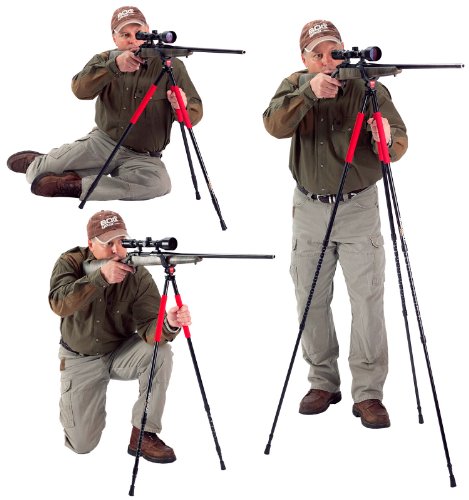 - Feature : Three-section, telescoping legswith height markers for quick, exact length adjustments plus leg stops to prevent over extension Rapid adjust twist locks Can be used in sitting, kneelingor standing positions with legsextending from 22" to 68" / Insulated, non-slip hand gripsin safety red True tripod head for addedstability. Universal Shooting Rest swivels 360° and has a non-slip scratch resistant rubber-coveringthat won't damage yourgun stock / Attached velcro strapto secure two or threelegs together for easein carrying / Weather-resistanttravel bag withshoulder strapincluded / Available in tripod,bipod, and monopod models
