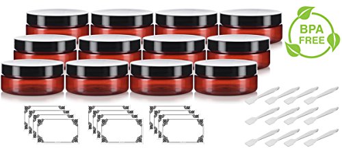 4 oz / 120 ml Amber PET Plastic (BPA Free) Refillable Extra Low Profile Jar (12 PACK) + Spatulas and Labels