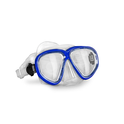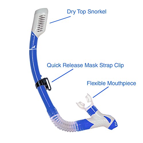 The set includes a mask with a tempered lens, dry snorkel that prevents water from splashing into the tube