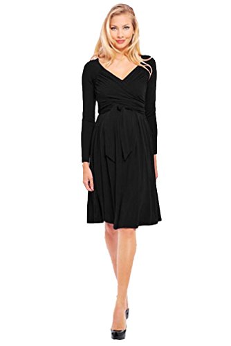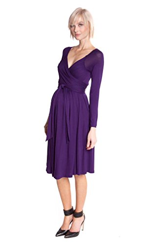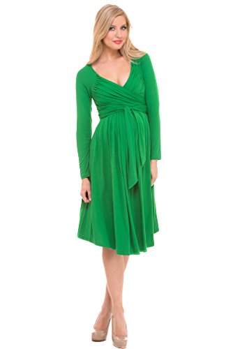 We are always on the lookout for great wrap dresses because they are so flattering and versatile. Not only do they look great during any stage of pregnancy, they also work well during the post-partum period and well beyond as you can adjust the fit to your changing body. The dress has long sleeves and a slightly below the knee length. Since you can adjust the neckline, this dress is ideal for the office when worn in a tight v and perfect for a night out with a more revealing neckline and some jewelry to dress it up. Sizing (order pre-pregnancy size) XS=0-2 S=4-6 M=8-10 L=12 XL=14 Available in Kelly Green or Purple 95%Rayon, 5%Spandex Machine Wash/Hang to DryFeature