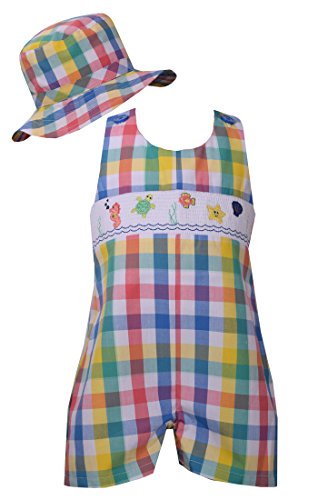 -. Binding : Baby Product -. Brand : Bonnie Jean -. Department : baby-boys -. Feature : 65% Cotton, 35% polyester. Lining: 100% Cotton / sea creatures embroidered smocked on the front / Button on the shoulder for closure / Come with matching hat / Wonderful dress to be wear year round -. IsAdultProduct : 0 -. Label : Bonnie Jean -. Manufacturer : Bonnie Jean -. ProductGroup : Apparel -. ProductTypeName : BABY_PRODUCT -. Publisher : Bonnie Jean -. Studio : Bonnie Jean -. Title : Bonnie Jean Little Boys Smocked Plaid Sea Shortall and Matching Hat