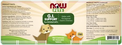 G.I Support for Dogs/Cats 90 chewable tablets Helps with Occasional Gastric Distress NOW Pets G.I Support aids in reducing occasional loose stools due to transport boarding or dietary changes to your pet's daily routine and helps with occasional gastric distress. This health supplement has been formulated by renowned veterinarian Dr. Barbara Royal DVM CVA founder of the Royal Treatment Veterinary Center. Directions for Use: Keep refrigerated to maintain potency. Dogs Take Orally Up to 40 lbs. 1 tablet twice daily 41 to 80 lbs. 2 tablets twice daily Over 81 lbs. 3 tablets twice daily Cats Take Orally 1/2 tablet twice daily Product Facts: Active Ingredients per tablet: A proprietary blend of: [Lactobacillus acidophilus Bifidobacterium animalis Lactobacillus plantarum Lactobacillus casei Lactobacillus salivarius Streptococcus thermophilus Bifidobacterium breve Bifidobacterium longum] 2 Billion CFU Inactive Ingredients: Cellulose chicken liver powder FOS (fructooligosaccharides) organic inulin powder silica stearic acid. Cautions: Safe use in pregnant animals or animals intended for breeding has not been proven. If animal's condition worsens or does not improve stop product administration and consult your veterinarian. Warnings: For animal use only. Keep out of reach of children and animals. In case of accidental overdose contact a health professional immediately. Keep freshness packet in bottle.