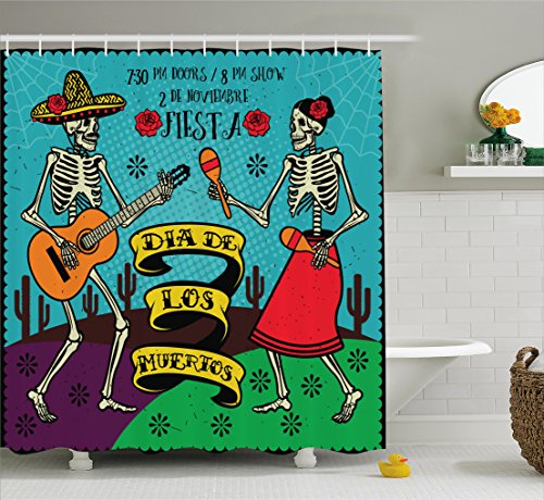 Day Of The Dead Decor Shower Curtain by Ambesonne, Dia de Los Muertos Festive with Spanish Couple Dancing Image Print, Fabric Bathroom Decor Set with Hooks, 75 Inches Long, Multicolor