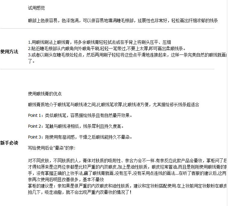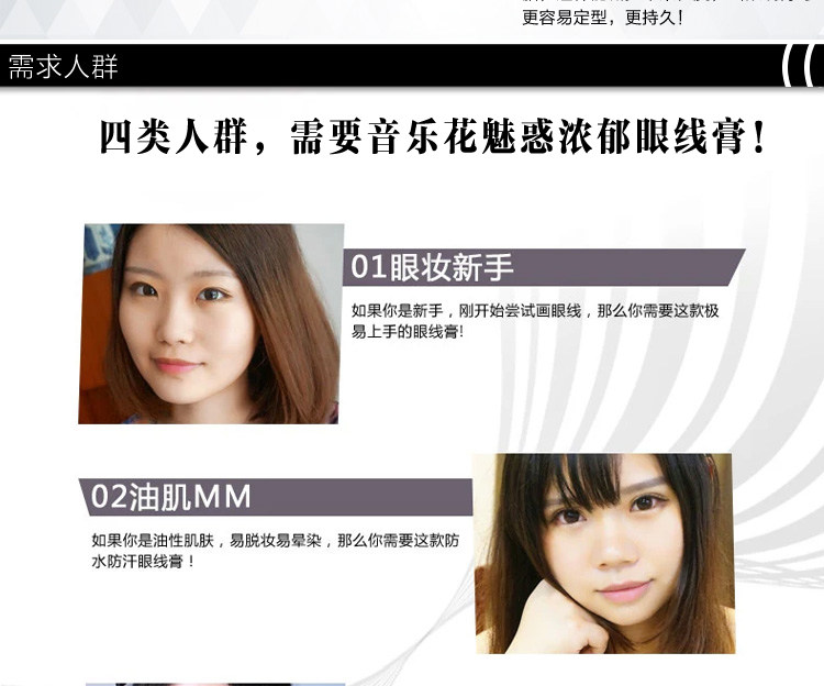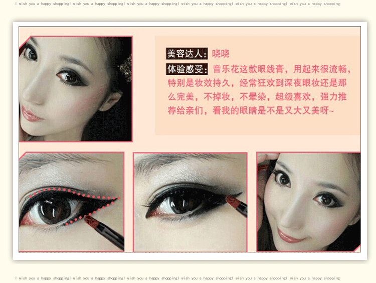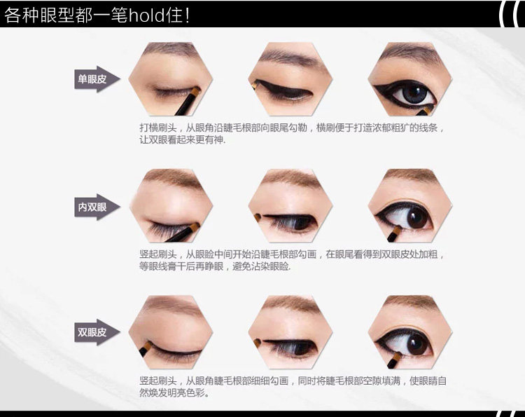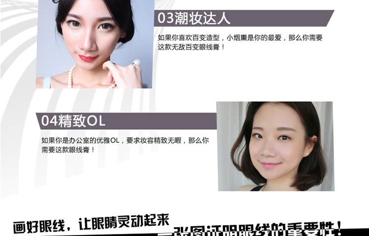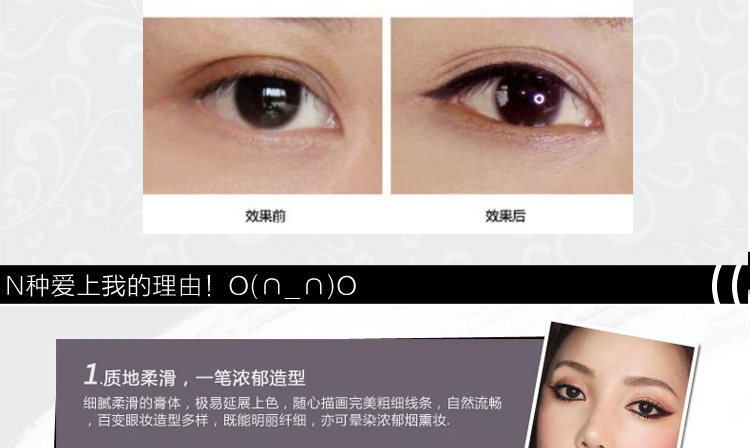 可强调眼部明暗对比的层次感,让女人的眼睛显得更大,明亮有神韵,还以修饰眼睛的轮廓哦!!持久型防汗,水,皮脂,可让眼妆更加持久,强调防水,防晕染,超持久的效果哦!!!