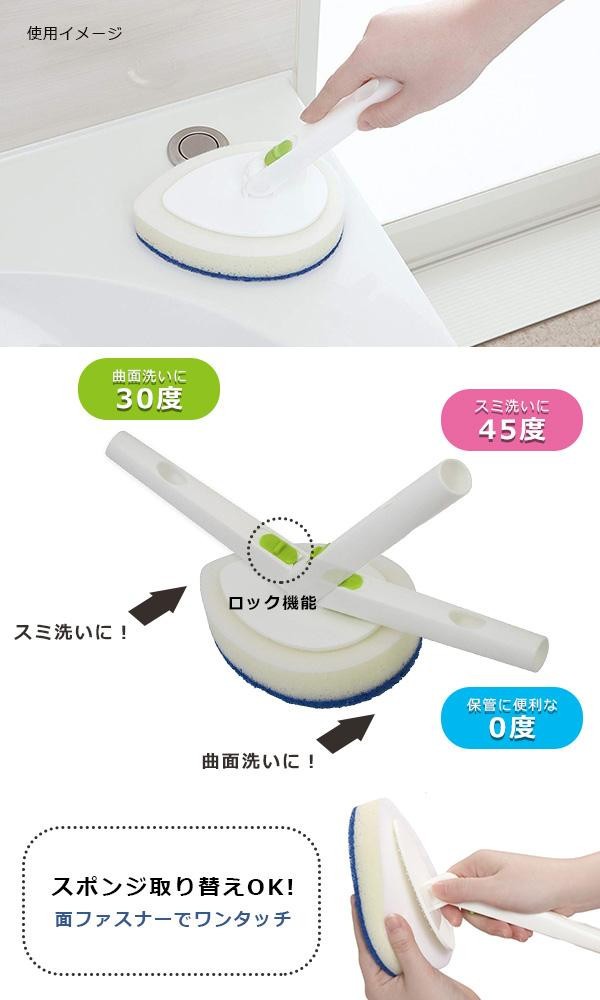 | スミも曲面も洗いやすいしずく型ヘッドです。アクリルビーズをナイロン不織布に付着させています。保管に便利な0度・スミ洗いの45度・曲面洗いの30度で角度調節可能! |