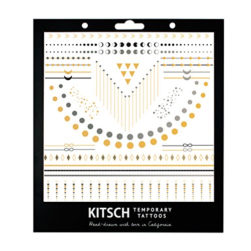 Metallic tattoos by kitsch are the must have accessory to add shimmer, flash and excitement to your outfit. Each piece reflects a delicate design featuring gold and silver foils or bright colors, perfect to wear as jewelry. From colorful flowers to geometric shapes to dainty henna designs, anyone is sure to find their favorite. Each style is drawn to allow creativity in which you can cut and then apply a variety of art designs to the body, creating bracelets, rings, hand chains, necklaces, anklets, arm bands. We are confident in having the most unique temporary tattoos you will find. Kitsch metallic tattoos allows the wearer to express individuality at any event. Stand out at your next pool party, beach bonfire, concert or music festival, just by adding kitsch metallic tattoos to your outfit. It's the perfect accessory to any wardrobe.Feature