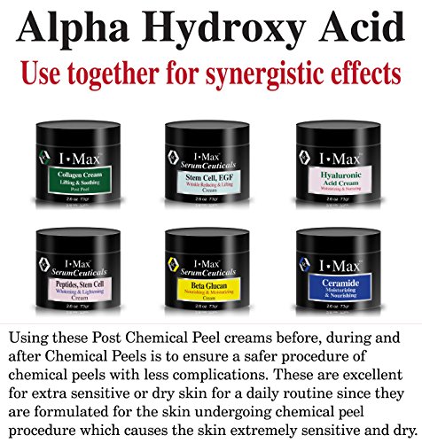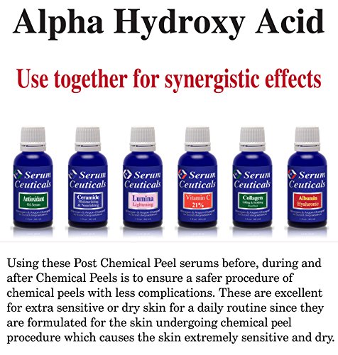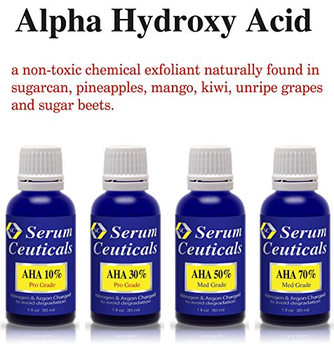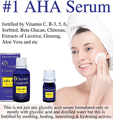 Alpha Hydroxy Acid (AHA) also known as Glycolic Acid, is the #1 active ingredient for chemical peel, which promotes smoother, younger looking skin by increasing the rate of cell renewal. This serum is fortified by chitosan, beta glucan, botanical extracts, vitamin B's & and; C and moisturizers for soothing and hydrating skin. It is a high concentrate 10% professional grade. But is not burning or irritating to the skin as much as other 10% glycolic acid products since this serum contains many calming and soothing active ingredients like chitosan, beta glucan, ginseng, ginger, aloe vera and green tea extracts. We offer 10%, 30%, 50% and 70% AHA serums in full size (1oz, 30 ml). You may have to dilute high concentrate of the serums of 50% and 70% for general skin rejuvenating. The higher concentrate is not necessarily better than the lower. We like to recommend you to combine our post chemical peel serums and creams for a synergistic effects.Feature