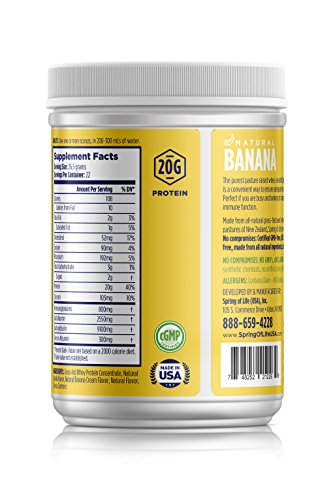 -. Feature : Sourced directly to SP.R.Ing of Life from 100% grass-fed cows from New Zealand that naturally graze on pastures year round; no hormones, certified GMO, no middle man. / Cold processed (undenatured), leaving the essential amino acids, cofactors, and other vital nutrients intact for maximum bio-availability and absorption. / New and improved extra Natural flavor with a sweet taste so you can safely indulge guilt-free (No toxic artificial sweeteners). / 20g of protein, 2g of sugar, 3g of carbs, and 100 calories. / A FLAVOR OPTION TO MEET EVERY TASTE - Choose from three naturally sweet flavors: Chocolate, Banana, or Vanilla.