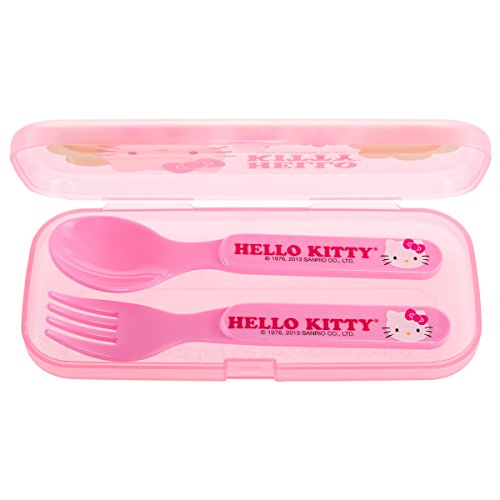 Fun lunch & dinnerware for toddlers and children; On-the-go travel feeding set w/latching lid case; Cute cartoon image of Hello Kitty at picnic; 2 pink child size plastic utensils, for ages 3+
