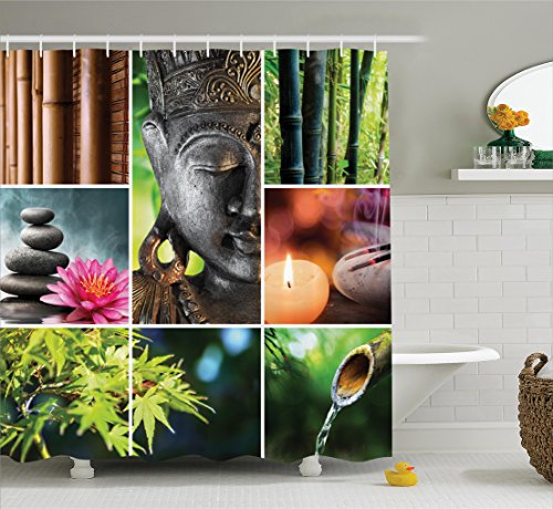 Ambesonne Spa Decor Collection, Oriental Culture Mosaic with Buddha Aromatic Candles Water Sounds Nature Image, Polyester Fabric Bathroom Shower Curtain Set with Hooks, Green Teal Pink Peru