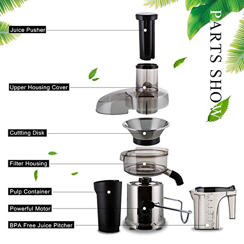 Detachable & Dishwasher Safe -The juice extractor comes with detachable and dishwasher safe parts, easy to assemble and easy to clean up after using. Safety locking arm, Overload Protection