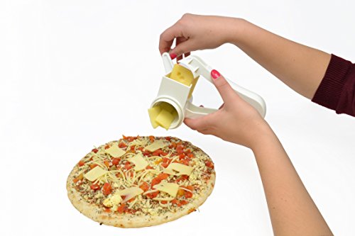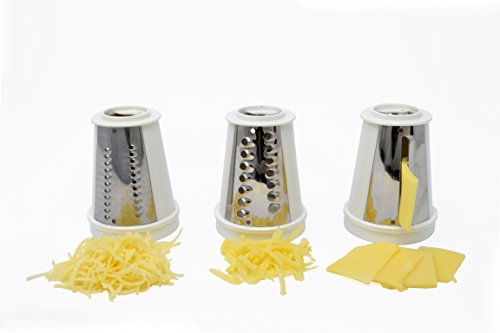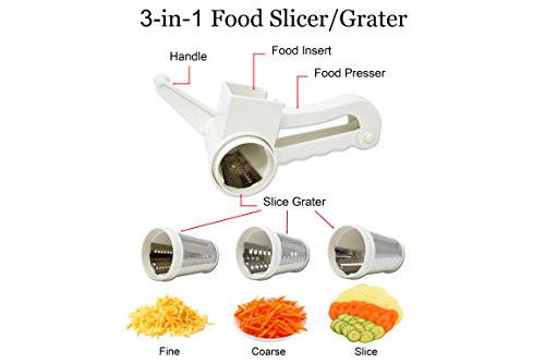 Product Description Cut Prep time in Half! This rotary grater set in white and stainless steel, includes 3 types of rotary blade settings: fine grater, coarse grater and slices. - Quick Consistent. - Shred Cheese Vegetables. - Easy to clean. - Small size for easy storing. 0