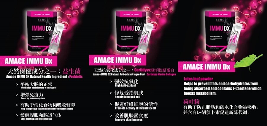 Immu-DX:Cassia seed 决明子,Sakura extract 樱花提取物,Probiotic 益生菌,Cartidyss Marine Collagen 海洋胶原蛋白,Lotus leaf powder 荷叶粉。