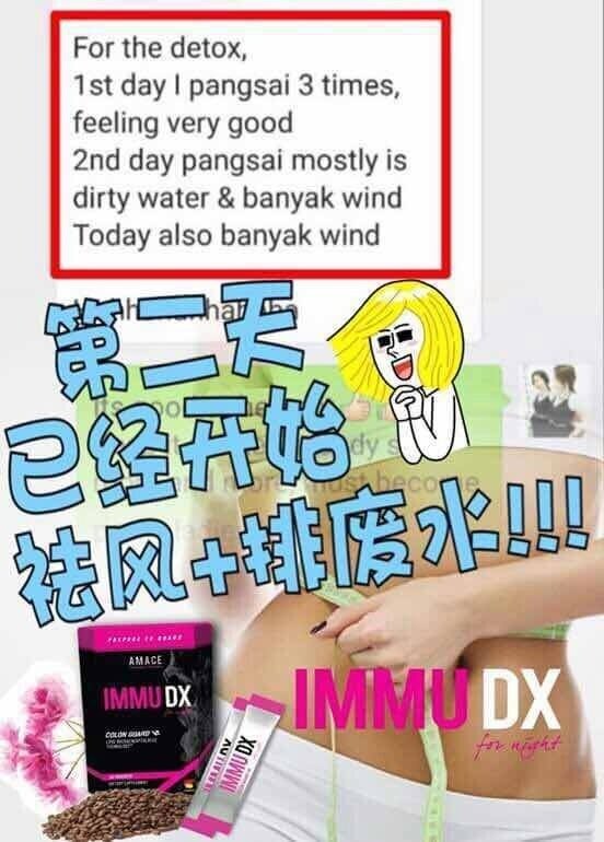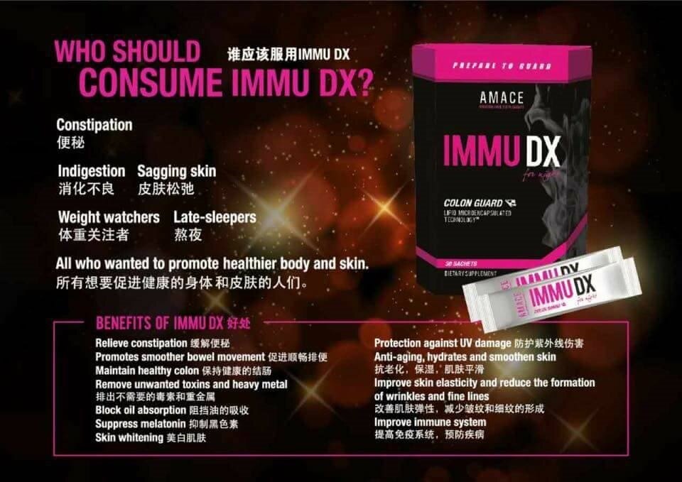 IMMUN DX is specially design for people that is looking for an easy detox diet with extra added values from plain detox product that is in the market. This formulation not only get rid of unwanted toxin, it promotes the skin benefits such as anti-aging, firming and whitening. It gives a miracle combination of inner and outer beauty health solution.