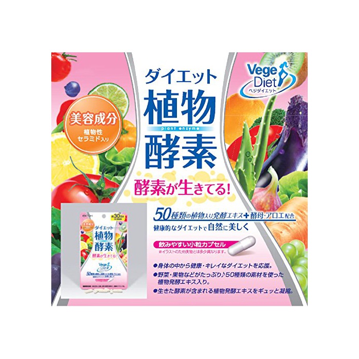 전성분 : 전분(유전자조 교환이 아니다)고, 식물 발효 엑기스(식물 발효 추출물,덱스트린,말《도데키스토린》)고, 젤라틴(돈유래)고, 《기다치아로에에키스》(덱스트린,《기다치아로에》추출물)고, 효모 추출물,파인애플 엑기스(세라미드 함유)고, 2산화 규소,스테아린산Ca,착색료(산화 티타늄(티탄))고, 환상 올리고당,(원재료의 일부에 밀,대두,키위 후루츠를 포함한다)