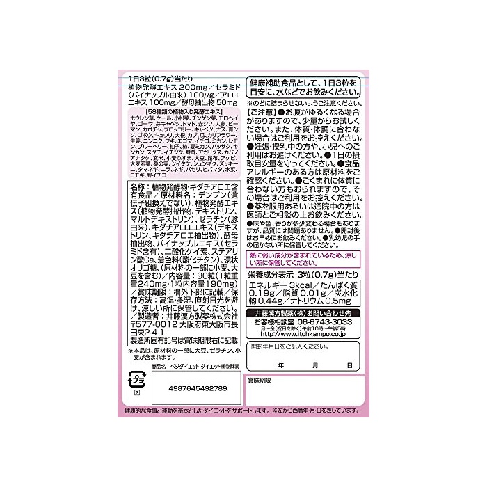 원본상품명: 井藤漢方製 ベジダイエット ダイエット植物酵素 約30日 190mgX90粒