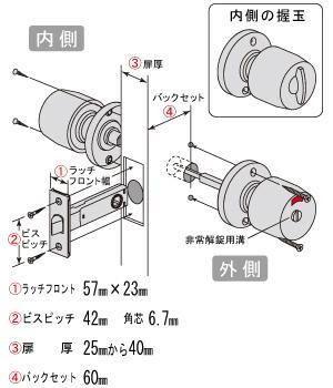 | 仕様 | 内かぎ付き(施錠表示有り) 種別:チューブラ錠 ラッチフロント幅:57mm×23mm ビスピッチ幅:42mm(角芯:6.7mm) 扉厚:25mm~40mm バックセット幅:60mm |