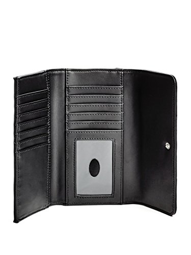 Feature : guess_factory_women_handbags_wallets_wristlets / guess factory women handbags wallets wristlets one / black tri fold faux leather design front emblem / flap closure interior features 12 card slots bill / pockets id window exterior zipper pocket le497451