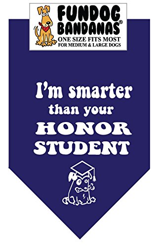 -. Binding : Misc. -. Brand : FunDog Bandanas -. Color : Navy Blue -. EAN : 0083351957728 -. Feature : Cute! / Fun! / Affordable! / Makes a great gift! / 22x22x31inches -. Label : The Dog Perk Corporation -. Manufacturer : The Dog Perk Corporation -. PackageQuantity : 1 -. ProductGroup : Pet Products -. ProductTypeName : PET_SUPPLIES -. Publisher : The Dog Perk Corporation -. Size : One size fits most for medium to large dogs -. Studio : The Dog Perk Corporation -. Title : BANDANA - I'm Smarter than your Honor Student for Medium to Large Dogs - navy blue -. UPC : 083351957728