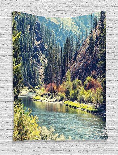 Ambesonne Lake House Decor Collection, Scenic Mountain with Pine Trees and Flowing River Colorful Foliage Daytime Sunshine Nature, Bedroom Living Room Dorm Wall Hanging Tapestry, Multi