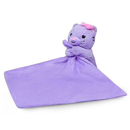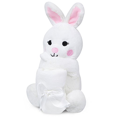 BUNNY PLUSH RABBIT RATTLE LOVIES: pink and white bunny plush animal for girls is a 9" plush toy with a rattle in its belly. Each stuffed animal has a 12" x 12" soft security blanket attached. Select your favorite animal or match your nursery decor or crib bedding.