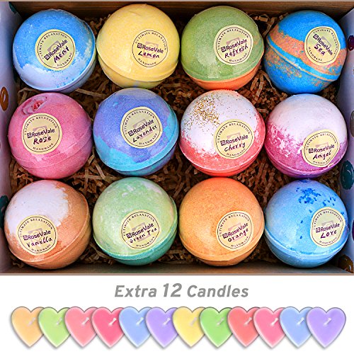 12 Bath Bombs Gift Set Super Large 5oz Each Best Gift Ideas for Women Teen Girls and Kids Handmade with Natural Vegan Shea & Cocoa Butter Spa with Fizzies and Included 12 Candles Mothers Day Gifts