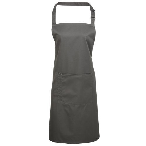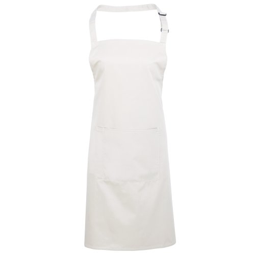 Studio : Premier Publisher : Premier Binding : Apparel Product Description Classic premier bib apron with pocket. Self fabric neck, self fabric ties 90cm long. Sliding adjusting buckle. 60ºC wash. Size One Size. Fabric 65% Polyester, 35% Cotton Twill Weight 195gsm Dimensions Width 28.5in, Length 34in 0