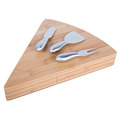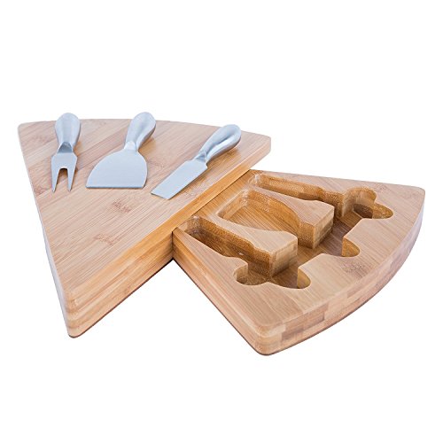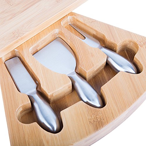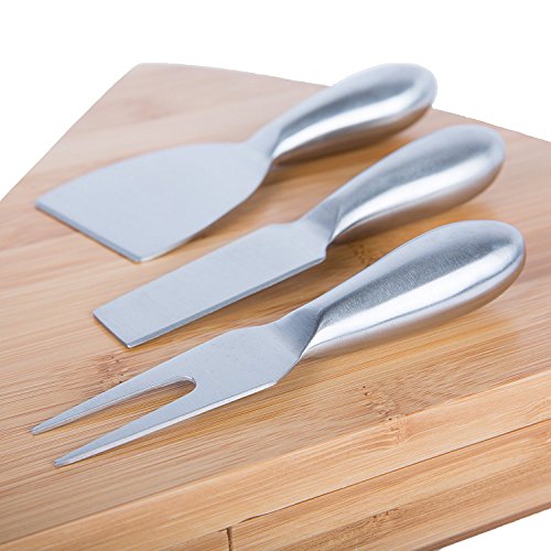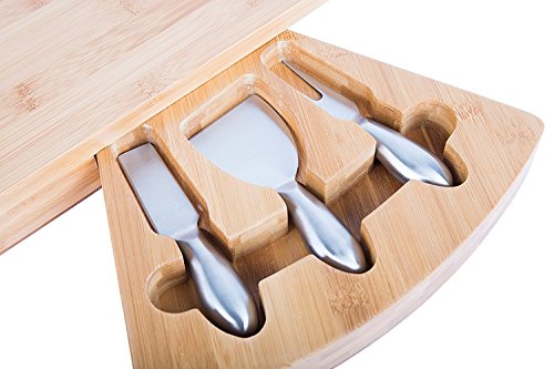 Bamboo Cheese Board and Knife Set. Natural Wood with Stainless Steel Cutter Tools for Hard Soft or Crumbly Cheeses. Unique Gift Idea