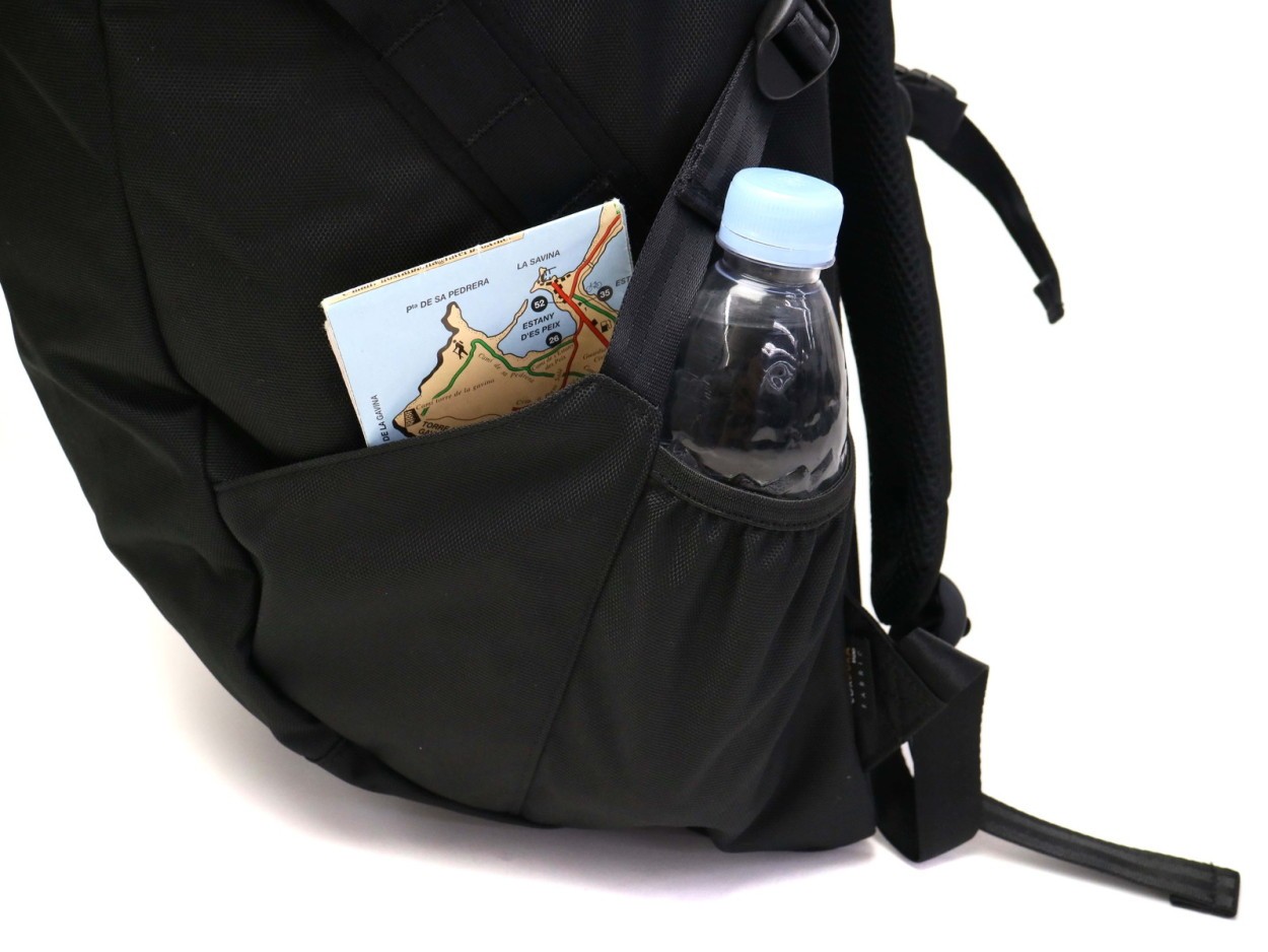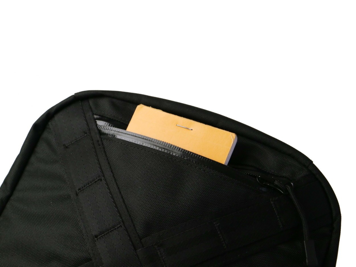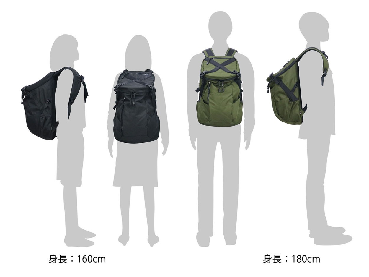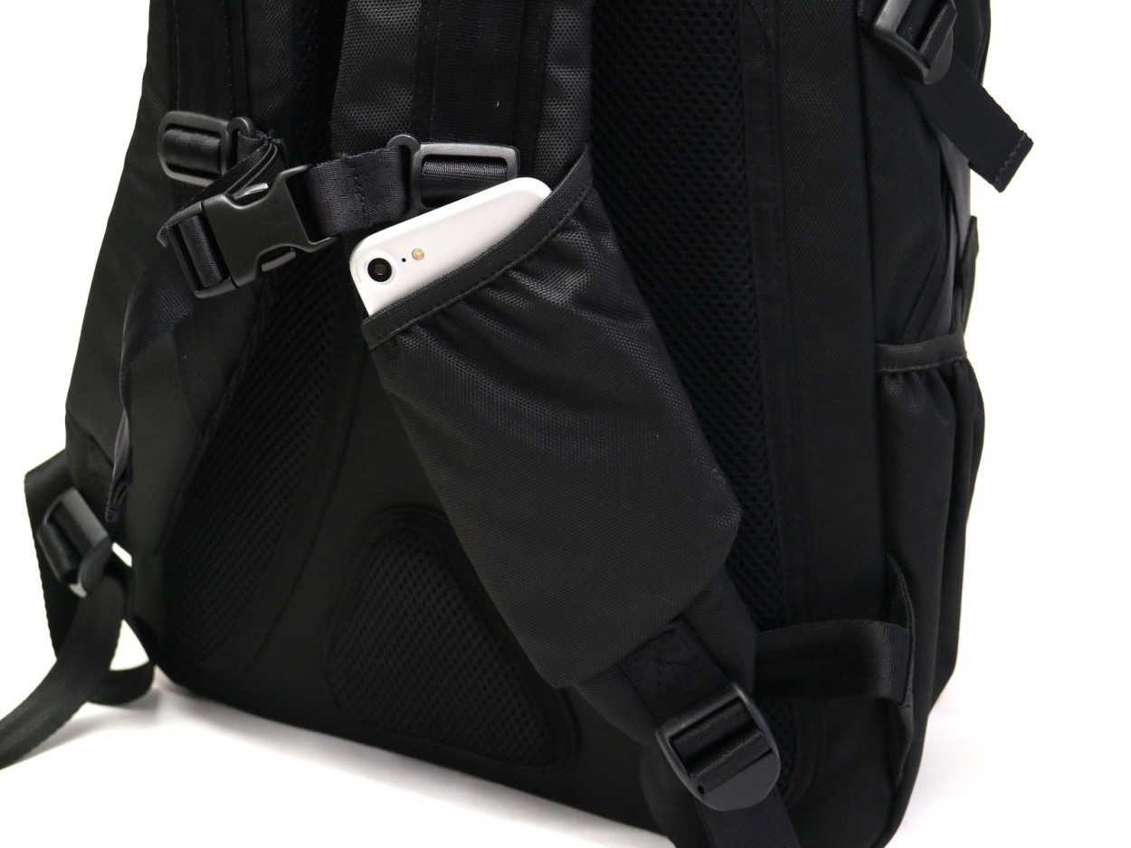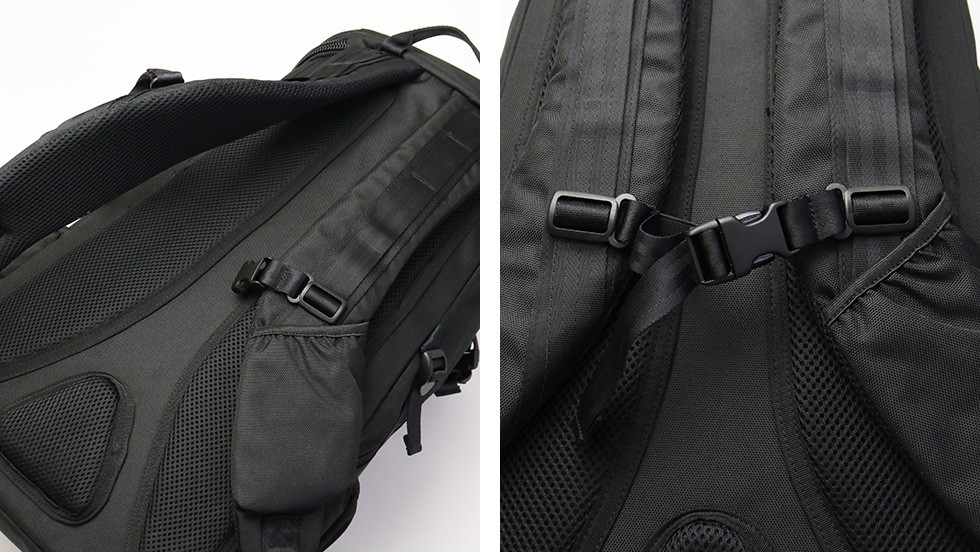 背負ったときに背中に接触する部分には通気性に優れたメッシュ素材に加え、身体への負担を軽減してくれるクッション性のある仕上がり。チェストストラップも備えられており、より身体にしっかりフィットさせて背負うことが可能です。