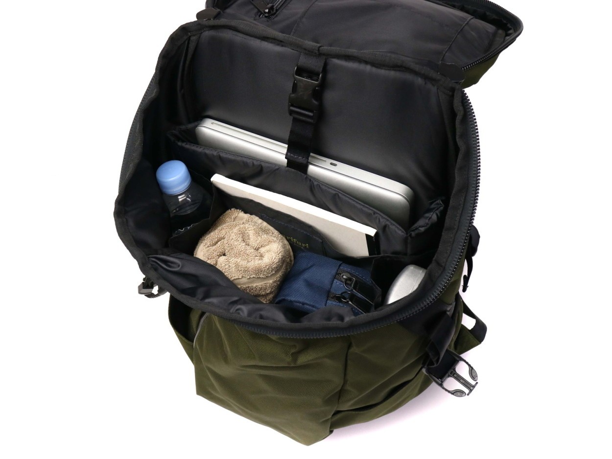 収納スペース内にはノートPCが収納可能なパッド付きのポケットやサイドポケット、上蓋裏に付く小物ポケットなどが充実しており、大容量ながらも使いやすさを追求した仕様になっています。