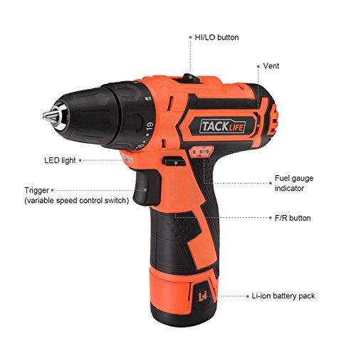 Tacklife PCD02B 12V Lithium-Ion Cordless Drill/Driver Max Torque 25N.m Variable Speed,19+1 Torque Setting with LED,8pcs Drill Bits,8pcs Driver Bits,1pcs Extension Bit Holder,1 Hr Fast Charger Included