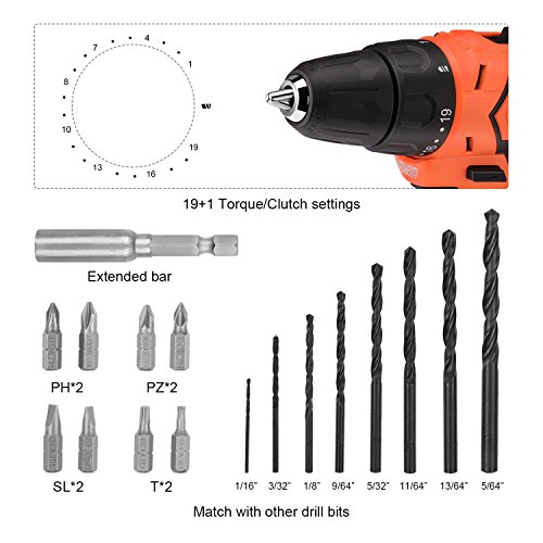 ▲19+1 TORQUE SETTING WITH CLUTCH - 19 different gear of torque and 1 gear of electric drill for drilling into wood, metal, plastic, and all screwdriving tasks; Max.drilling capacity is 1-18”(30MM) for wood, 25/64”(10MM) for metal; Clutch provides precise control and protect the screws effectively