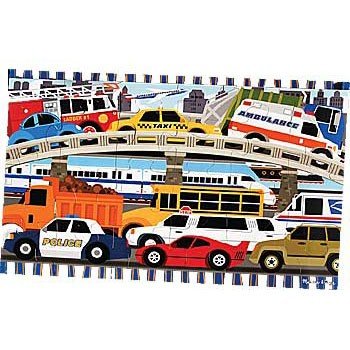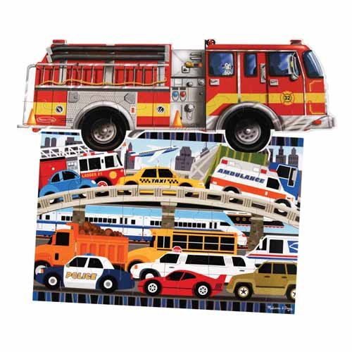 Product Description All modes of transportation are featured in one 24 PC. 2' x 3' floor puzzle. The fire truck-shaped puzzle is ready to go with 24 cardboard pieces to complete the 4' long assembly. Ages 3 Yrs. . 0