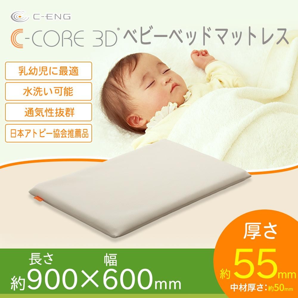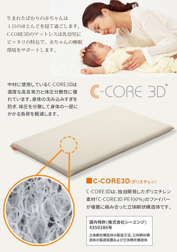 | 中材に使用しているC-CORE3Dは適度な反発力があり、体圧分散性に優れています。中材は水洗いが可能。またカバーもご家庭の洗濯機で洗えるので、汗やおもらしで汚してもお手入れしやすく清潔に保てます。中材は立体網状構造により90%以上が空気を通す隙間です。汗をよくかく乳幼児にも抜群の通気性で湿気がこもることがありません。日本アトピー協会の推薦品。中材は空気の隙間が多い構造です。 |