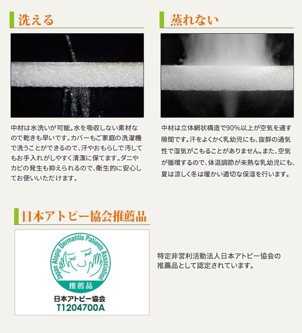 中材に使用しているC-CORE3Dは適度な反発力があり、体圧分散性に優れています。中材は水洗いが可能。またカバーもご家庭の洗濯機で洗えるので、汗やおもらしで汚してもお手入れしやすく清潔に保てます。中材は立体網状構造により90%以上が空気を通す隙間です。汗をよくかく乳幼児にも抜群の通気性で湿気がこもることがありません。日本アトピー協会の推薦品。中材は空気の隙間が多い構造です。 |