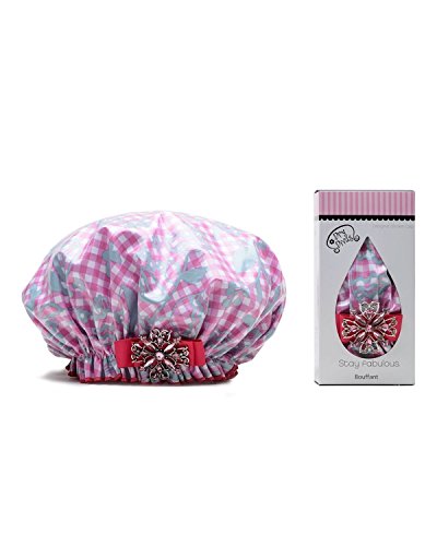 Dry Divas Designer Shower Cap For Women - Washable, Reusable - Large Bouffant Cap With Vintage Jeweled Brooch (Glorious Gingham)