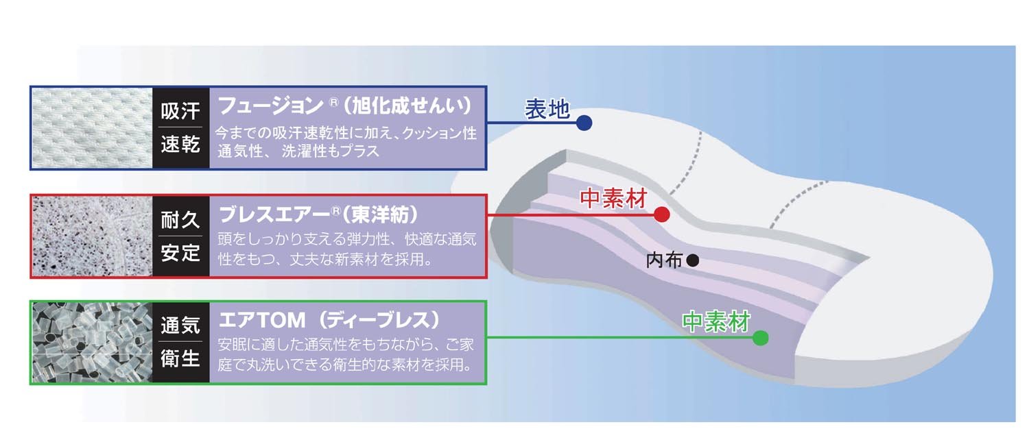 Medium to decide elasticity · · · "Breath air (R) / Toyobo" elasticity & breathability to support the head stably, durable material