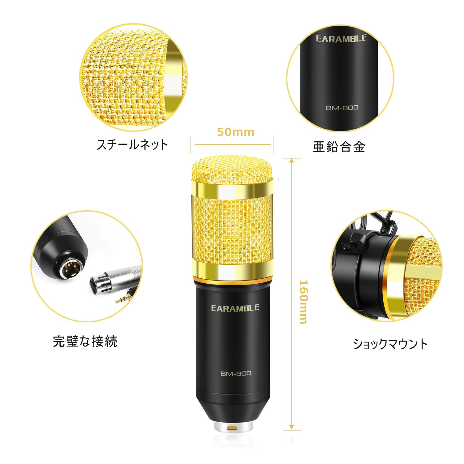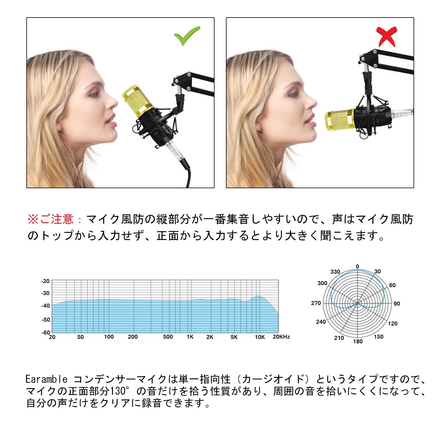 Since the Earamble condenser microphone is a type of unidirectional (cardioid), it has the property of picking up only the sound of 130 ° in the front part of the microphone, making it difficult to pick up the surrounding sound, recording only his own voice clearly