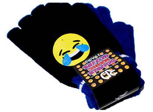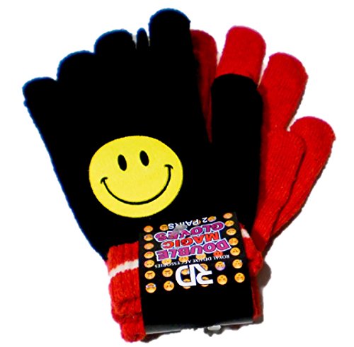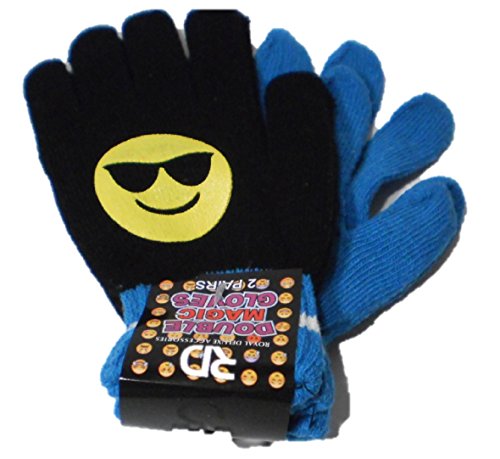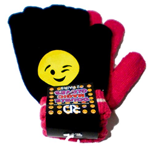 Product Description 2 pair of children's knit gloves. Black pair has Emoji on both gloves with a striped cuff. The second pair is a solid color matching the color of the black pair. Great to have a second pair when playing in the snow. 0